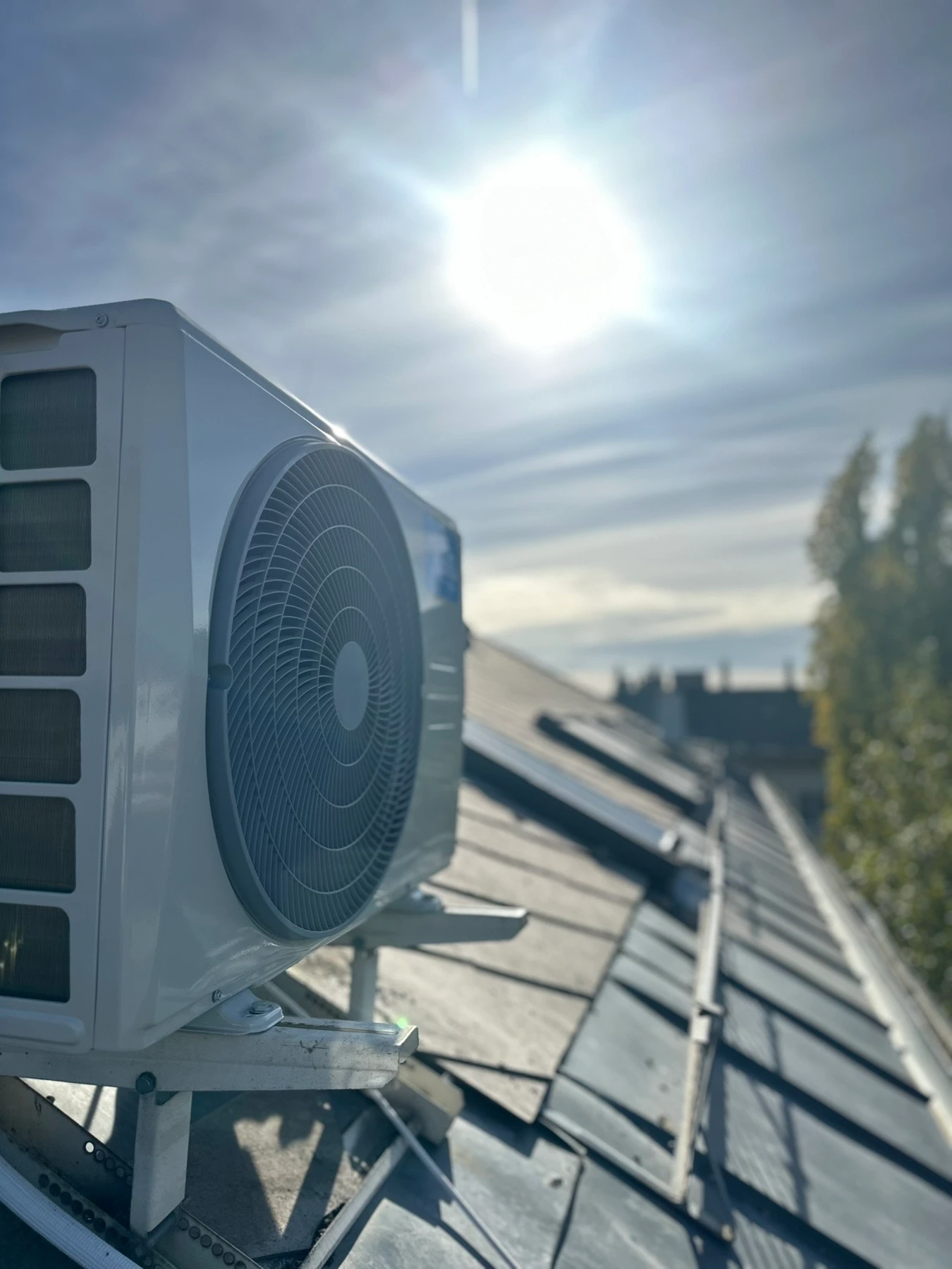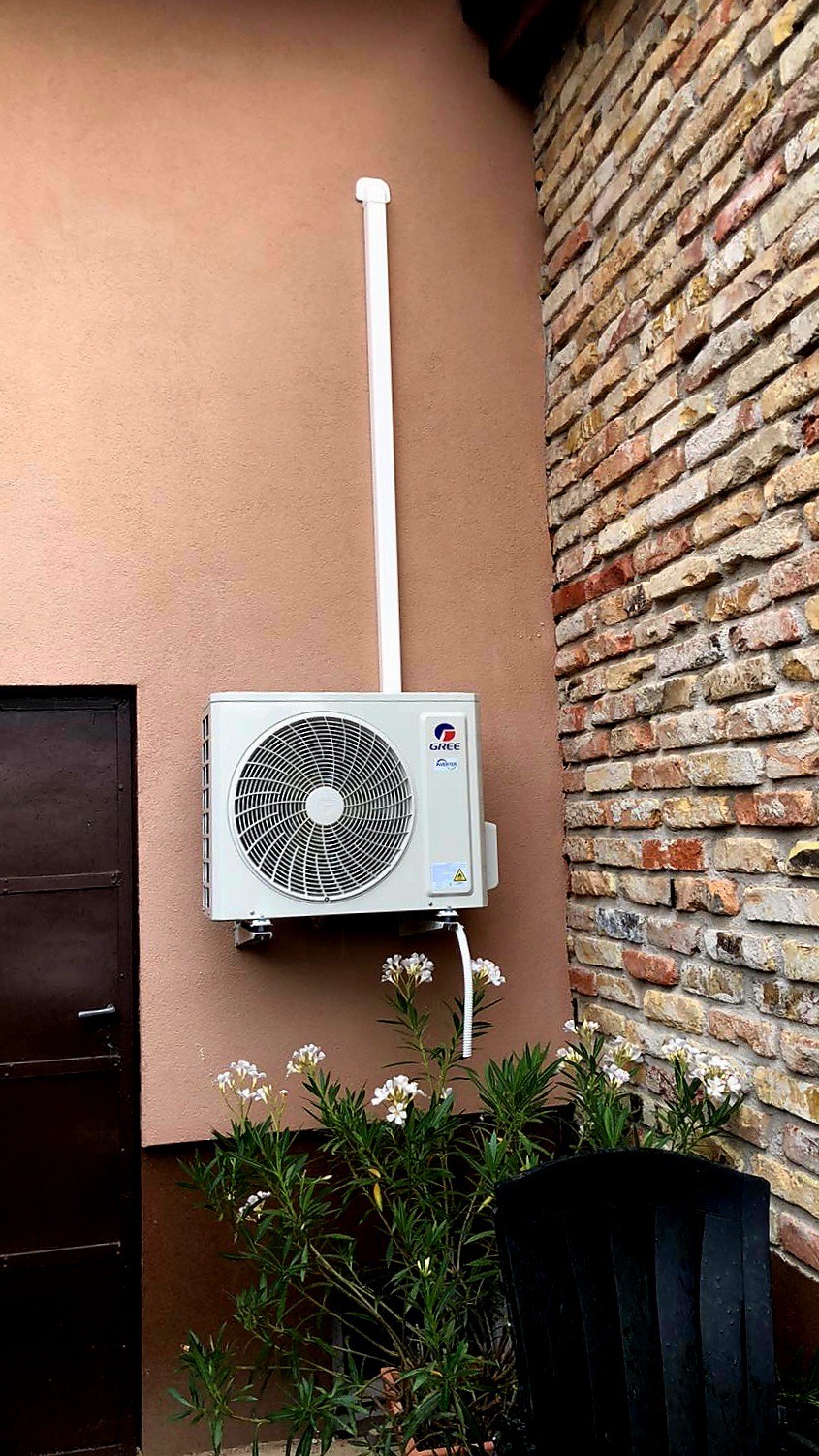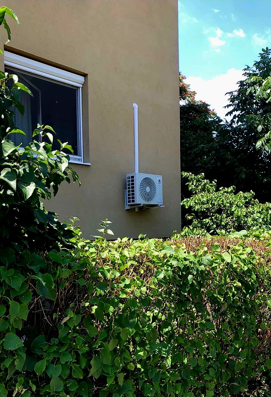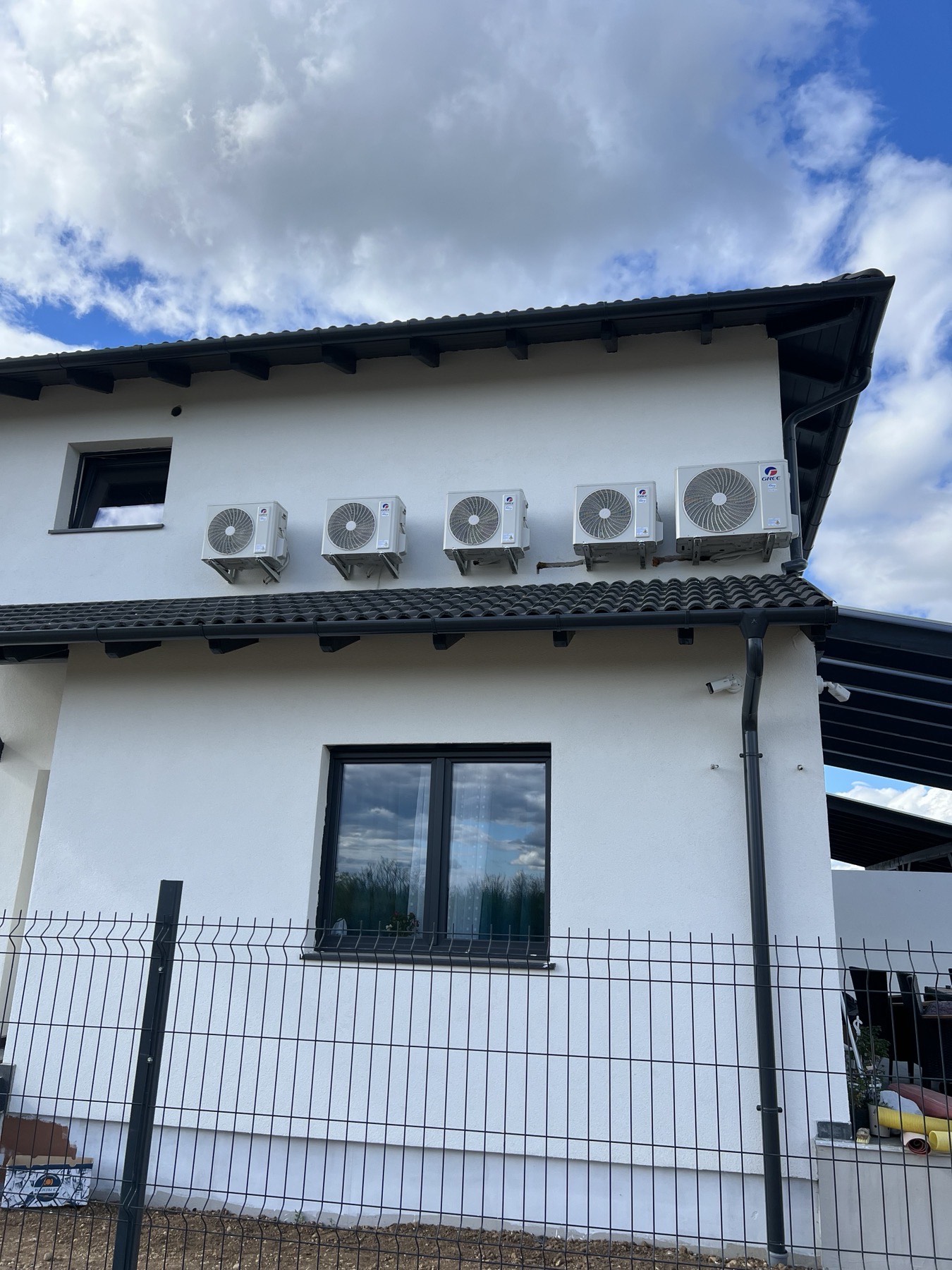 A képen látható projektünk alkalmával 5 db kültéri egységet kellett felhelyeznünk. Nem ez a munka nehezebb fele. Még csak nem is a beltéri egységek felhelyezése. A munka nehez, hogy megrendelőnk megelégedésére, minden apró részletre figyeljünk. Gondolunk itt a csövek és kábelek vezetésére, csatlakozások kialakítására, funkcióra és esztétikára egyaránt. Nem csak szépnek kell lennie a ki- és bevezető kábelek és csatornák illesztéseinek, de műszaki szempontból is fontos a minőségi, részletekre ügyelő munkavégzés.